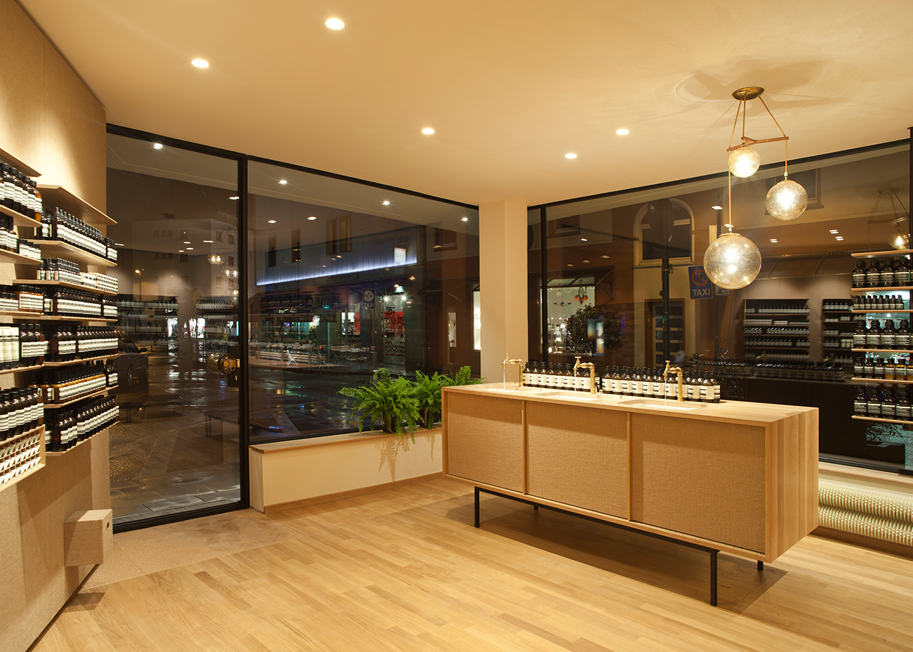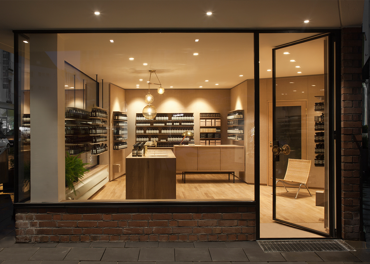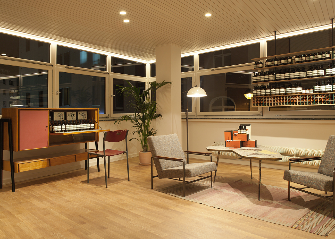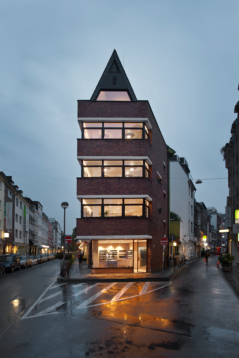 1966 von dem Kölner Architekten Karl Band als Wohnhaus Vigelius errichtet, ist das Gebäude ein selten erhaltenes originales Zeugnis der 60er Jahre Architektur. Durch behutsame Eingriffe wie die Entfernung entstellender Einbauten und Erneuerung der erdgeschossigen Glasfassade mit filigranen Stahlprofilen gelang es, den Charakter zu erhalten und gleichzeitig das Gebäude einer neuen Nutzung als hochwertige Verkaufsfläche zuzuführen. Wo immer möglich, wurden die vorhandenen Oberflächen nur überarbeitet, ein ausgefeiltes Lichtkonzept sorgt für die richtige Inszenierung von Architektur und Verkaufsprodukt.