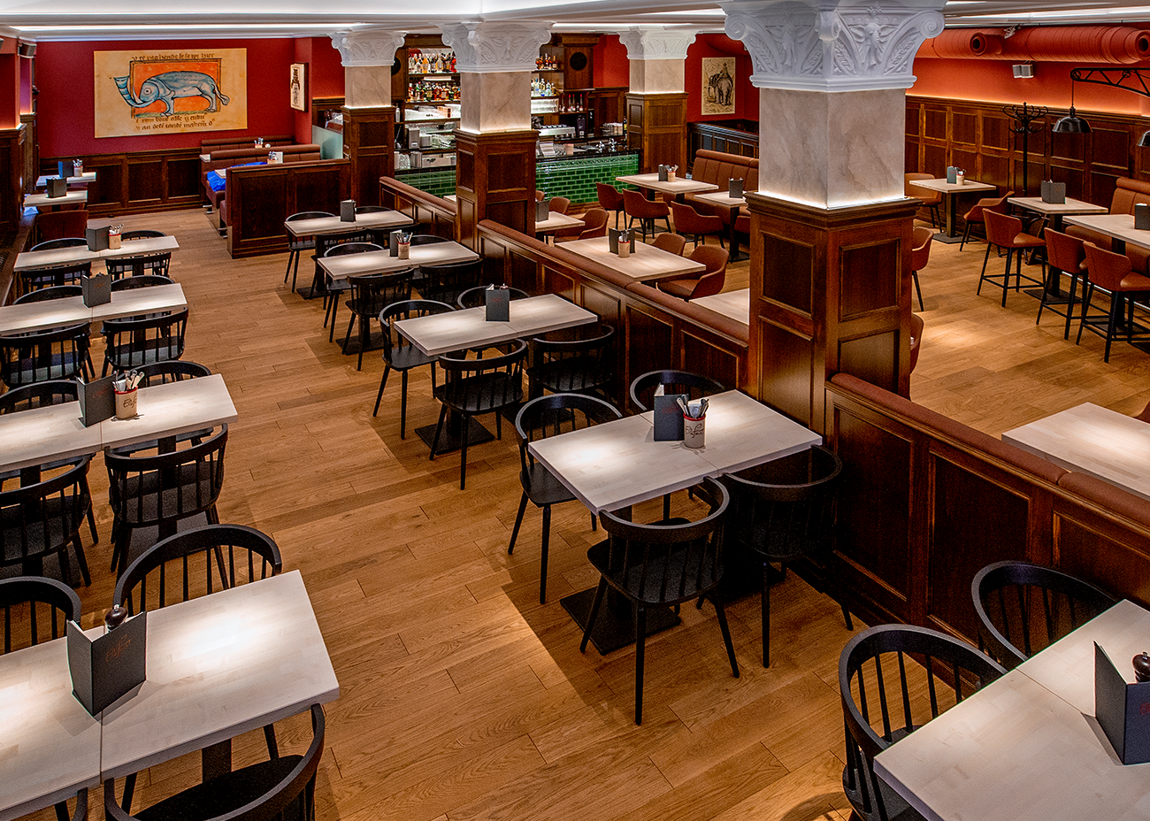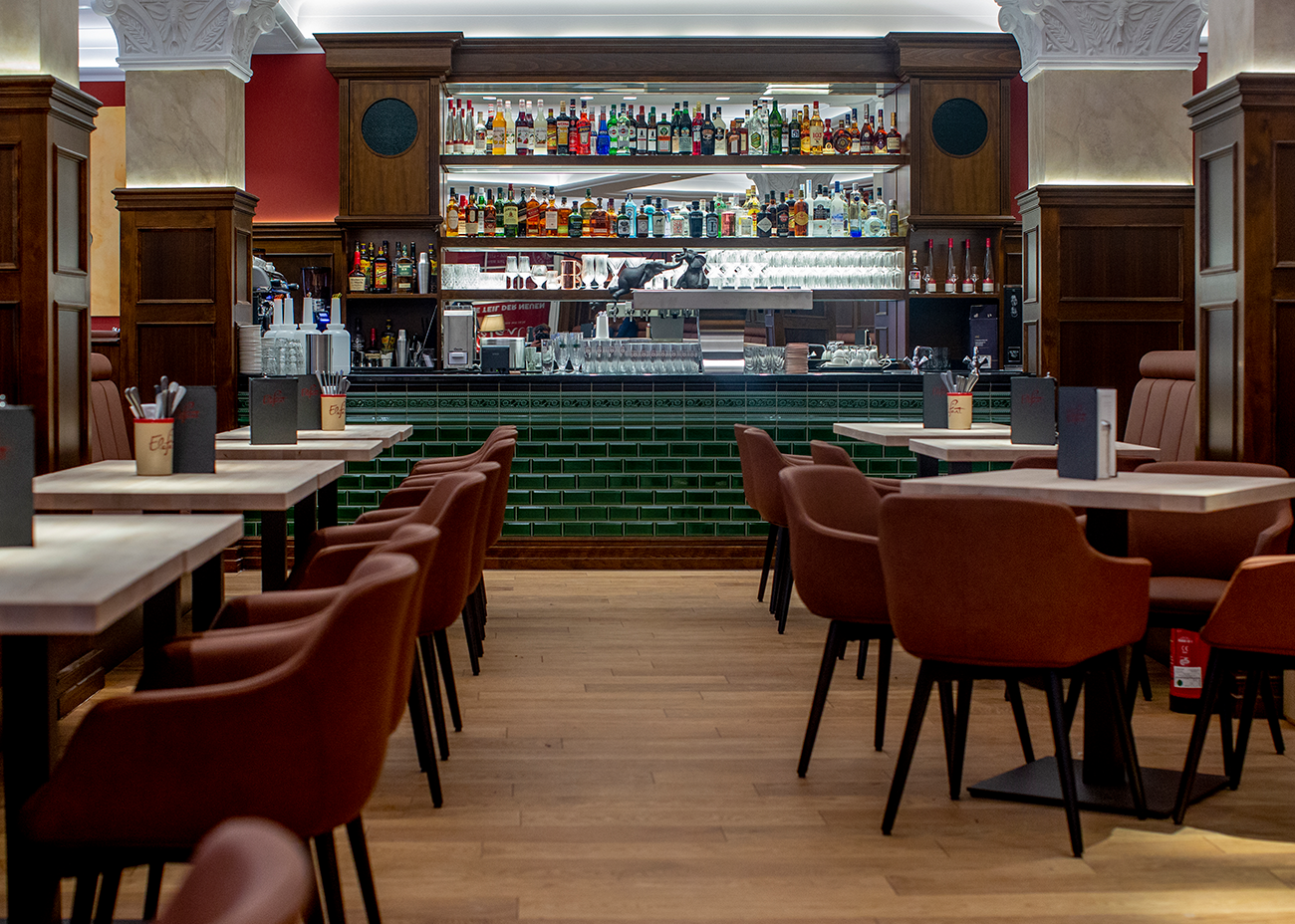 Vordergründiges Ziel beim Umbau dieses denkmalgeschützten Gebäudes in der Bonner Innenstadt war die Beseitigung brandschutztechnischer Mängel und die Ertüchtigung des Tragwerks, insbesondere der Decken. Bei der Gelegenheit wurde die Gaststätte im Bereich von Küche und Theke im Erdgeschoss sowie Warenannahme und Lagerung im Untergeschoss neu konzipiert und z.B. der ursprünglich vorhandene Seiteneingang wieder geöffnet. Er dient sowohl zur Bedienung der Außengastronomie in der Seitenstraße als auch als zweiter Rettungsweg für den Gastraum. Auch die Haustechnik wurde erneuert und heutigen Anforderungen angepasst. Die Gestaltung der Inneneinrichtung einschließlich Licht stammt von dem Kölner Büro GV.