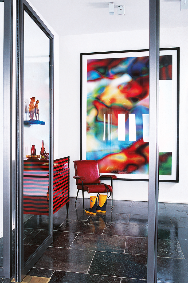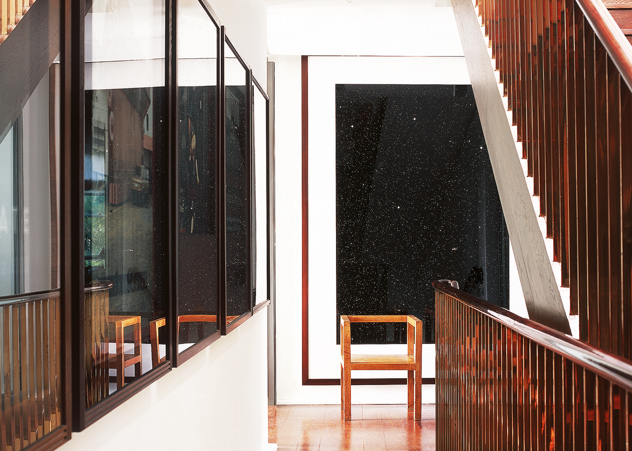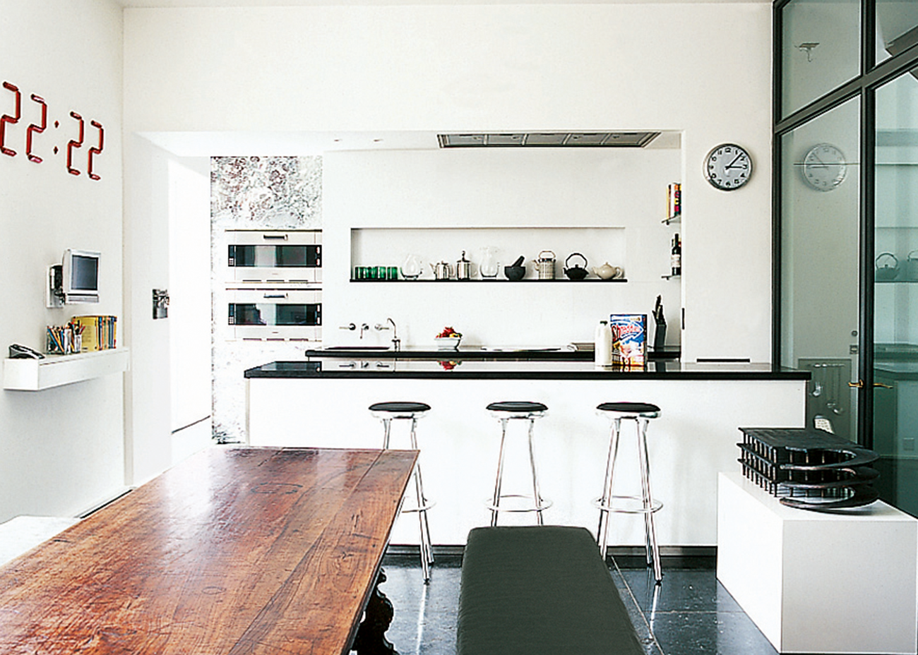 Das denkmalgeschützte Stadthaus aus dem Ende des 19. Jahrhunderts wurde vollständig umgestaltet, um für eine fünfköpfige Familie mit einer ausgedehnten Sammlung zeitgenössischer Kunst eine großzügige, lichterfüllte Umgebung zu schaffen. Das Äußere des Hauses wurde gründlich restauriert, einschließlich Erneuerung des Schieferdaches und Einbau neuer Fenster. Die vormals dunkle Inneneinrichtung wurde entfernt und durch eine offene Raumabfolge ersetzt. Eine Eichentreppe mit Geländer aus massivem Messing verbindet alle vier Geschosse in einem durchgehenden Treppenhaus, das von einer eleganten Stahl-Glas-Konstruktion eingehaust ist. Ess- und Kochbereich sind im Erdgeschoss zusammengelegt, nur eine Anrichte ist abgetrennt, alle Räume sind durch einen einheitlichen indonesischen Kalksteinboden miteinander verbunden. Auf Gartenniveau wurde das Haus um einen zurückhaltenden Glasbau für einen innenliegenden Schwimm- und Spa-Bereich erweitert, ausgelegt mit eigens gefärbten und glasierten Lava-Fliesen. Der Blick vom Essbereich geht über das begrünte Dach dieser Erweiterung ungehindert zum neuen formal angelegten Garten. Eine Skulptur, vom Bauherrn entworfen, bewacht Garten und Wasserbecken. Dieses Projekt wurde in Zusammenarbeit mit SA, New York realisiert.